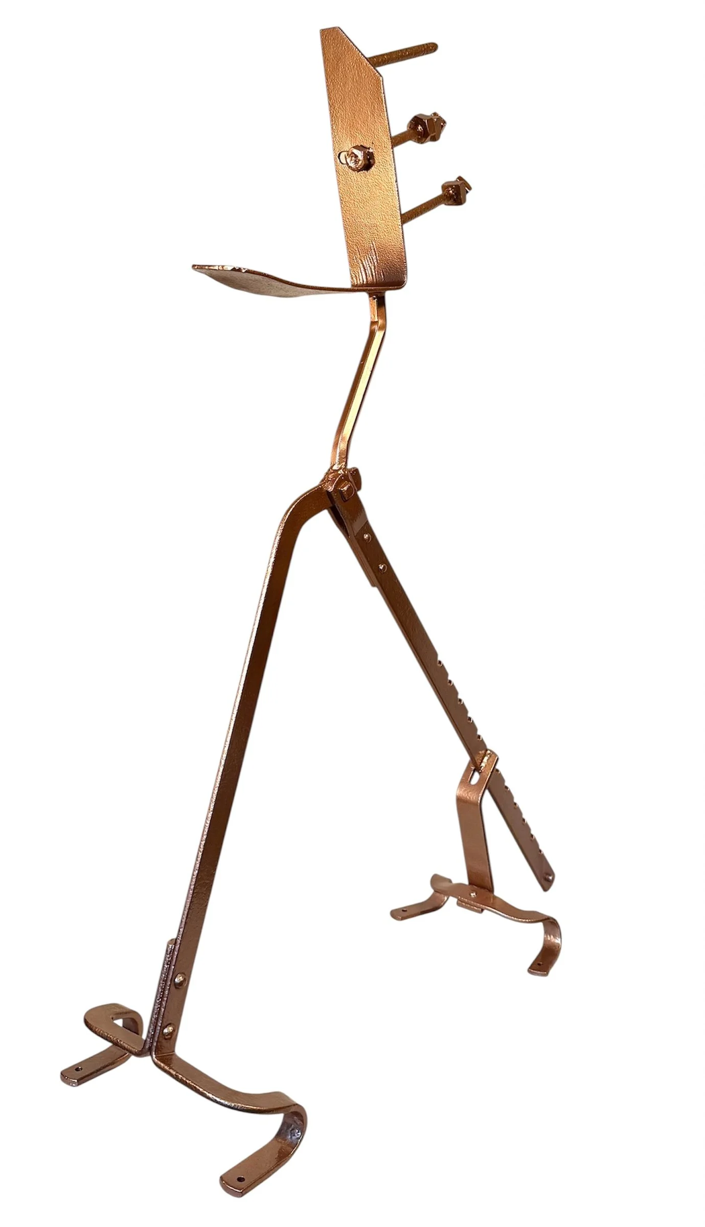 “Pez Lives” is an African inspired toy displayed in recycled steel. I based this piece on the plastic candy “Pez” toy dispensers from the 1950’s. Each toy had a head of a comic character and to receive the candy you flipped the head back and the candy was dispensed. My sculpture is exactly the same, but when you flip the head back and it dispenses a metal washer instead The steel elements of the sculpture are heated with an acetylene torch, hammered, shaped and stick welded. After brushing the surface with an electric wire wheel, the surface is coated with Val oil.